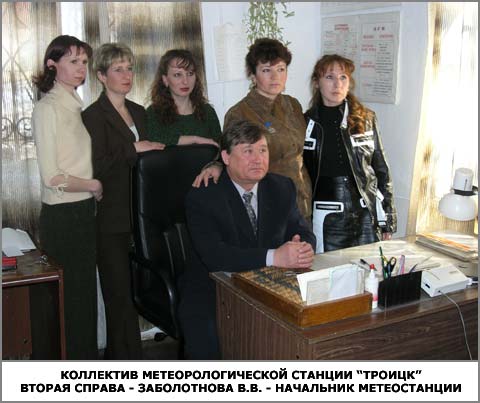 В настоящее время на метеостанции работают техники-метеорологи: Абдулина О.Н., Главатских Н.Д., Манакова Н.А., Шацкая Н.Н. Более 30 лет отдала Службе погоды начальник метеостанции Заболотнова Валентина Владимировна, которой присвоено звание «Почетный работник Гидрометслужбы». Высокий профессионализм начальника метеостанции, отличная теоретическая и практическая подготовка сотрудников станции, их творческое отношение к работе, поиск новых решений, овладение современными методами наблюдений и обработки метеорологических данных - вот та основа, на которой крепится слава метеостанции Троицк.