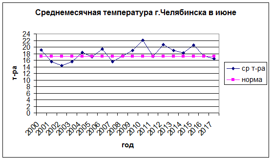 Июнь 2017 года в Челябинске отличался неустойчивой погодой. Короткие периоды теплой погоды сменялись более длительным похолоданием, часто шли дожди, грозы отмечались 5 дней. Абсолютный максимум 15 июня достигал 30°, абсолютный минимум – 1 июня +2°. В итоге - за месяц выпало 96% климатической нормы, среднемесячная температура (16,5°) оказалась на 0,7° ниже средней многолетней. Но предыдущие рекорды не перекрыты. В этом столетии холодная погода преобладала в 2001, 2002, 2003,  2007 годах, а самым холодным был 2002 год (14,4°).
