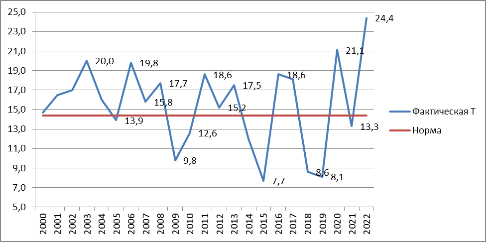 Рис. Среднесуточная температура 1 сентября с 2000-2022 гг.